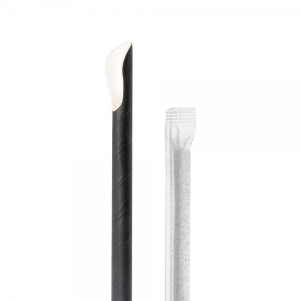 CANNUCCE CON CUCCHIAINO IND. BIANCHE Ø0,8x21 CM NERO CARTA (100 UNITÀ)Confezione cannucce con cucchiaio. Le cannucce di carta sono la nuova alternativa ecofriendly alle tradizionali cannucce di plastica essendo fabbricate con materiali biodegradabili resistenti ai liquidi freddi o caldi. In bianco, nero, naturale o a colori. Sono disponibili anche in versione imbustata.